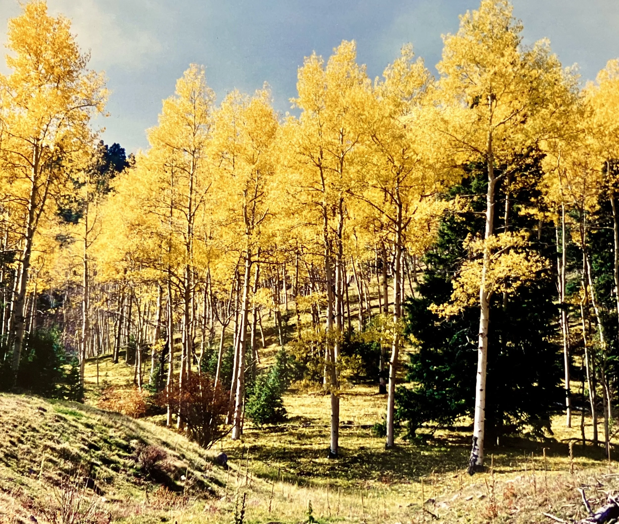 We were following a fence line along a grove of trees when suddenly the road opened to a wide valley bordered by brilliant gold aspen. Nestled amid endless grassy meadows, crisscrossed by a meandering stream, was a butter-yellow stucco house, a big barn, a log cabin, and an old wooden corral, all glistening in the late morning sun under a deep blue September sky. Three horses—a bay, a chestnut, and a palomino—were grazing along the creek. My heart began pounding like a drum.